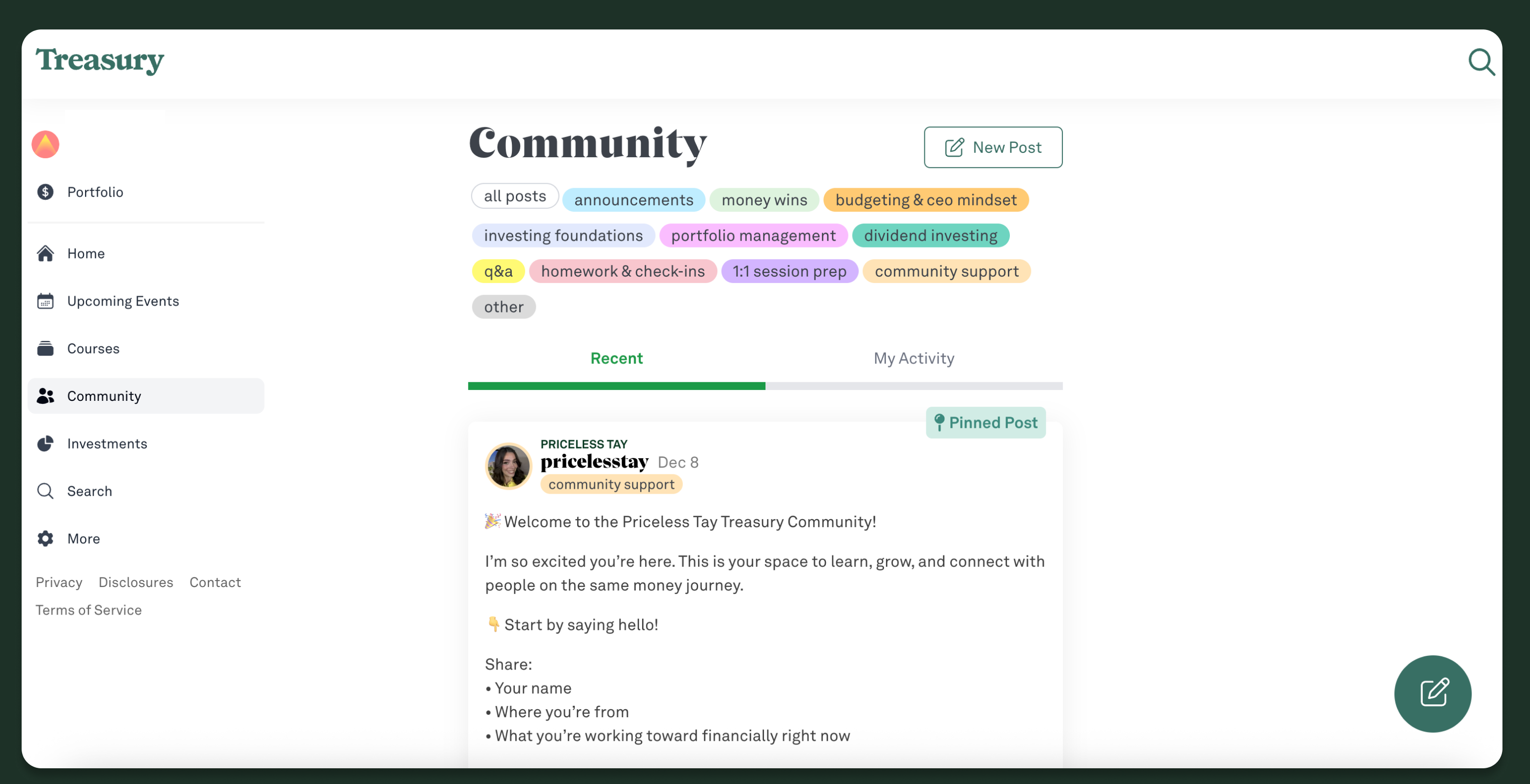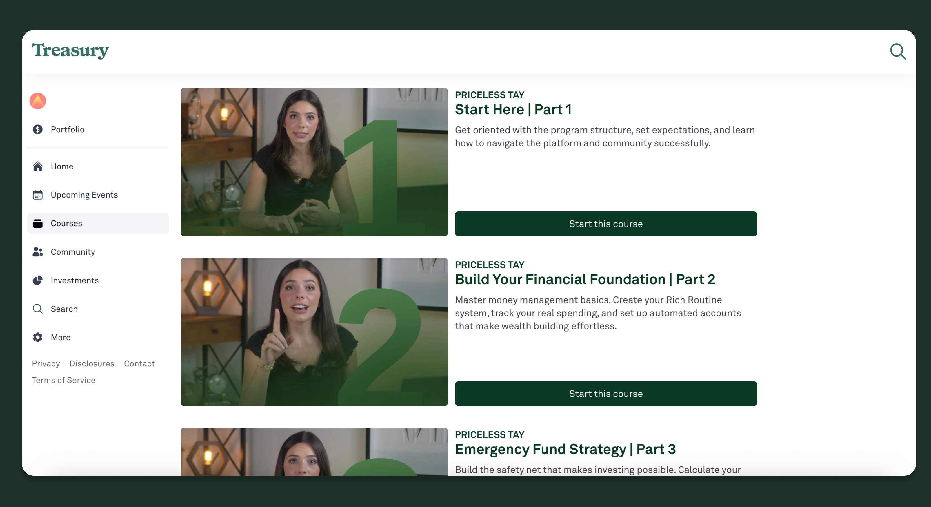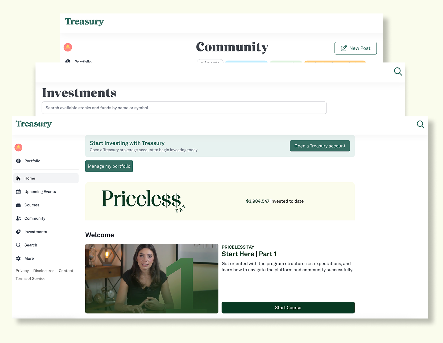 Weekly group office hours (Wednesdays), private community (Treasury), access to licensed professionals for general education + troubleshooting.