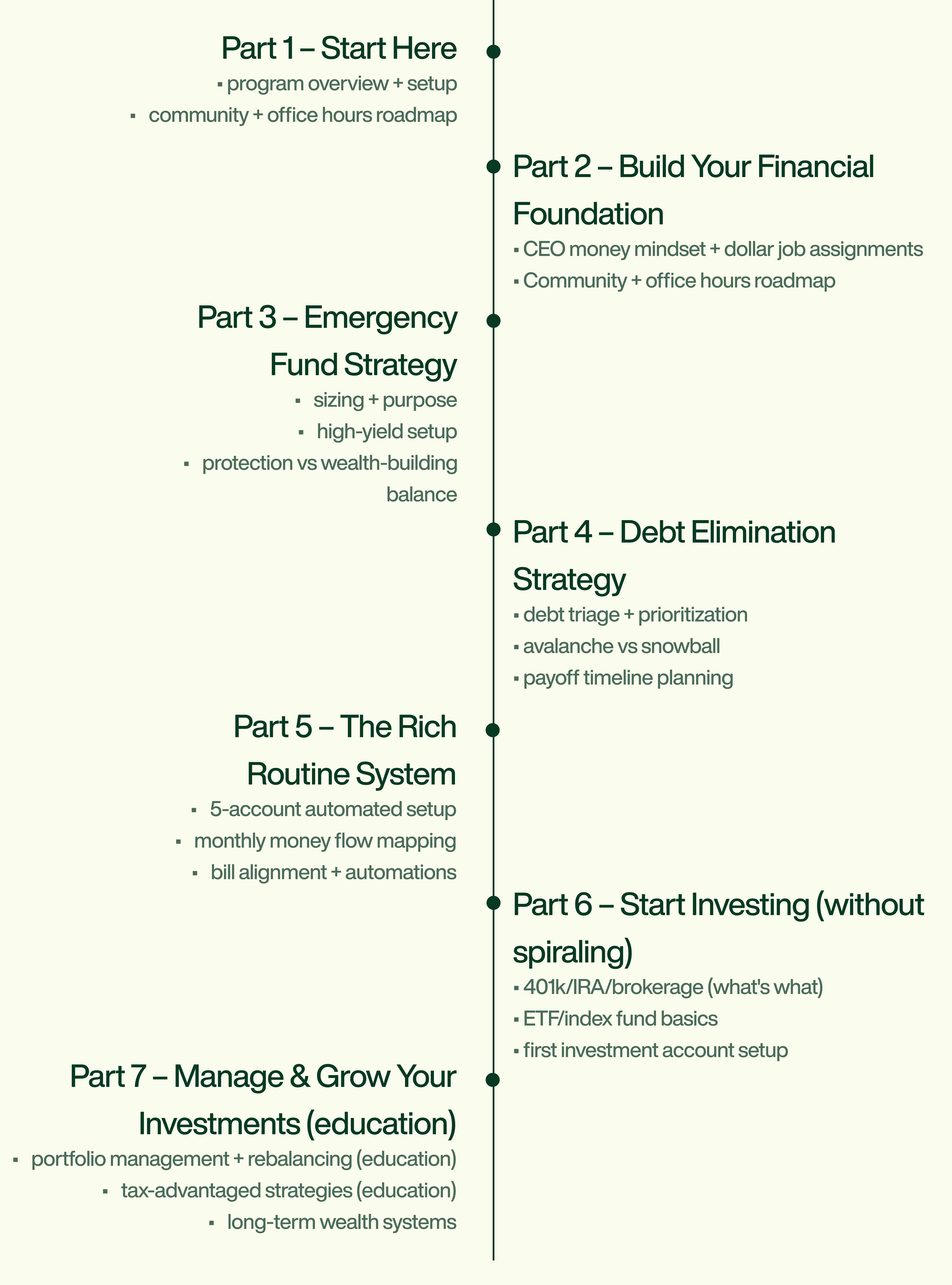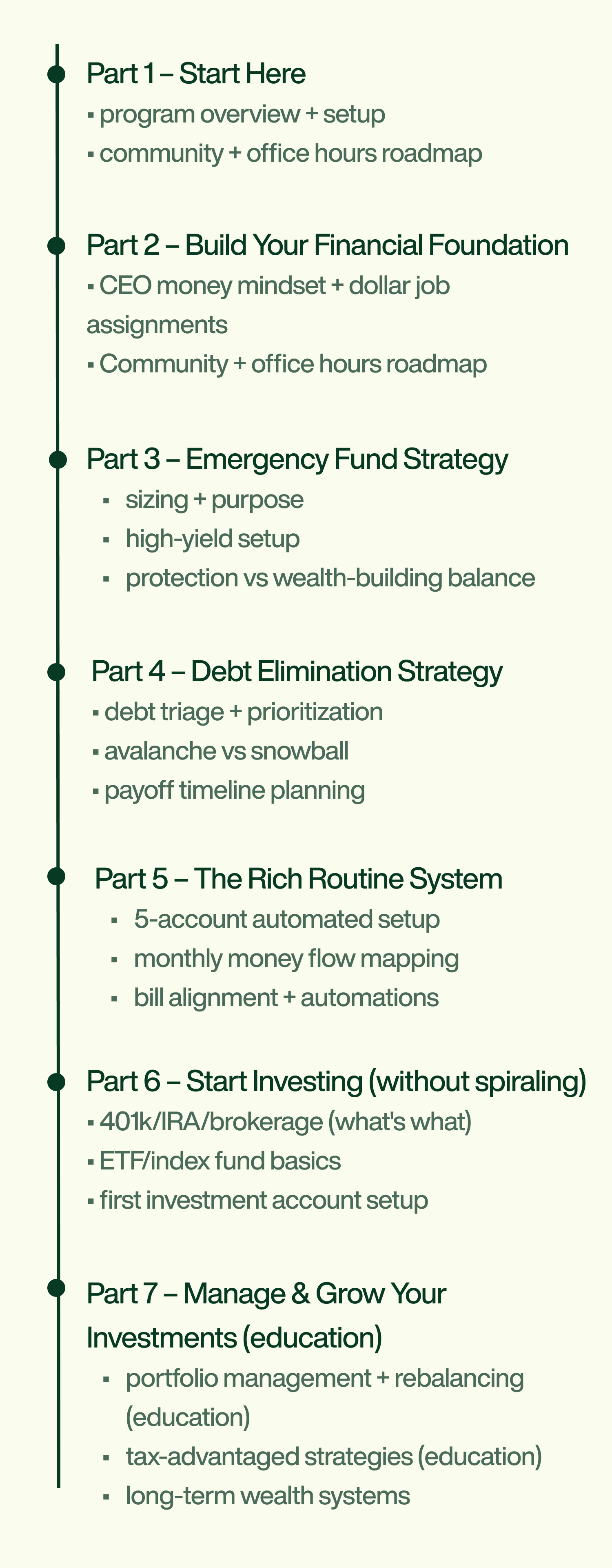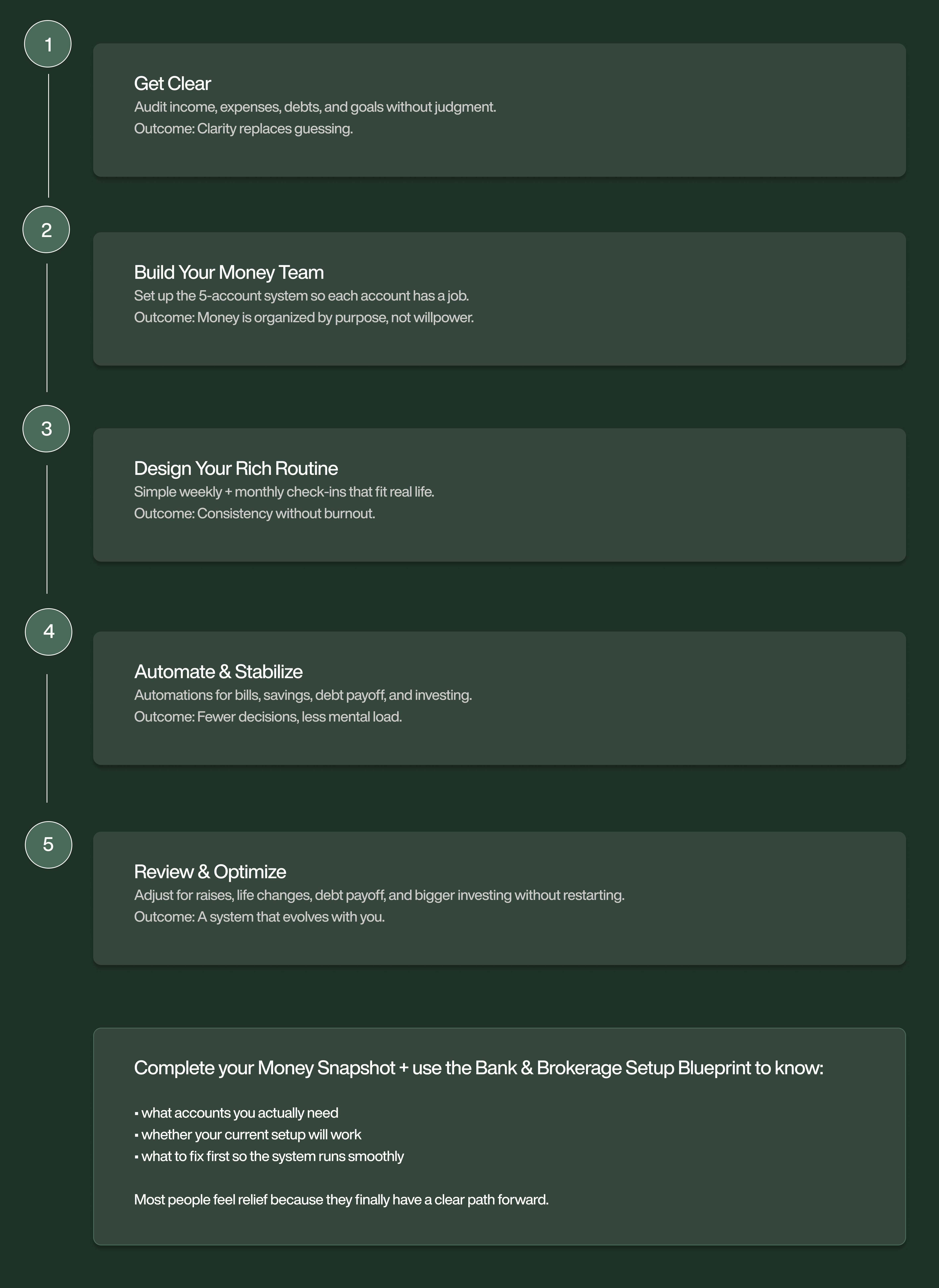 The Money Team Method step-by-step, the Rich Routine weekly + monthly rhythm, paycheck flow mapping, and investing foundations without overwhelm.