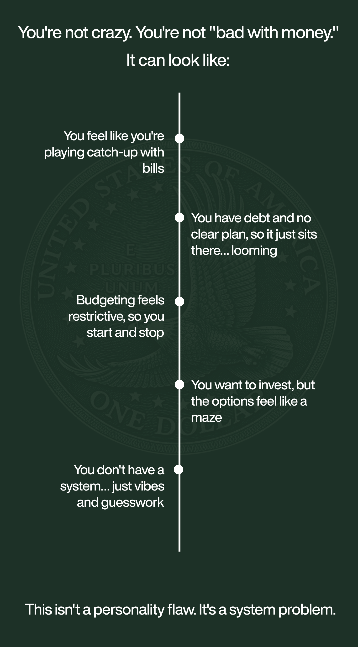 ✓ You're roughly 22–34 and money feels inconsistent, stressful, or messy
